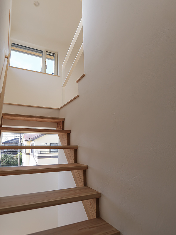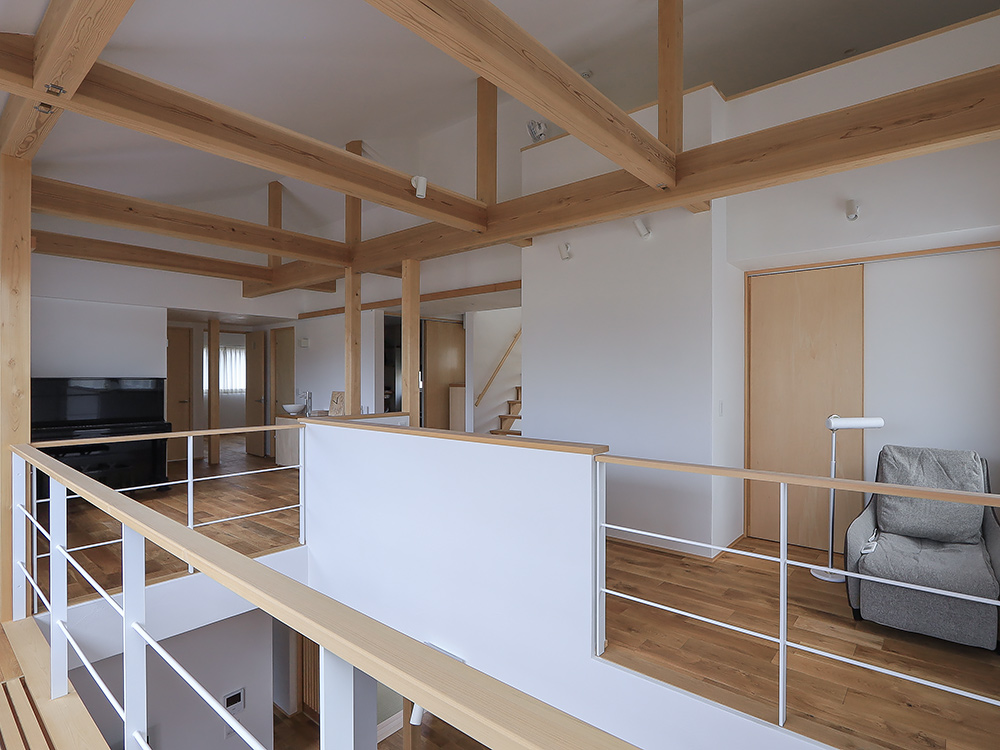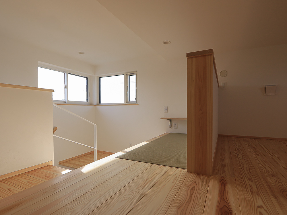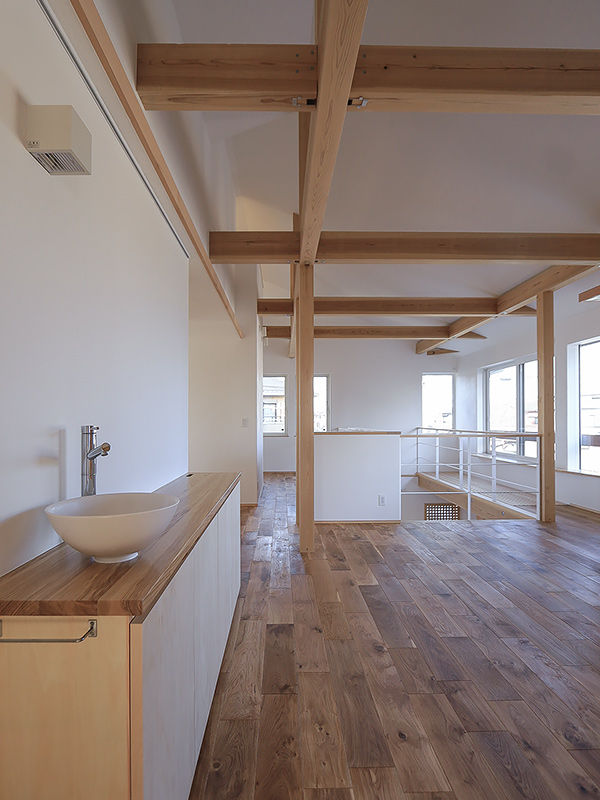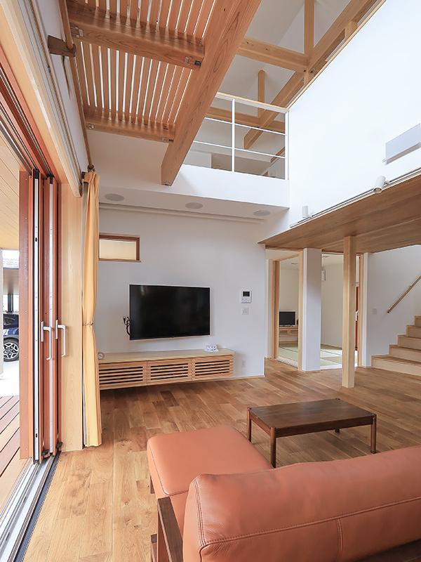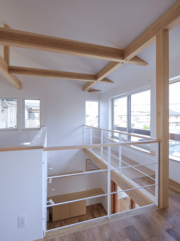 吹抜けや小屋裏、造作棚など、木の良さを随所に感じられる家になりました。