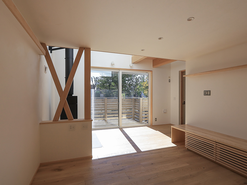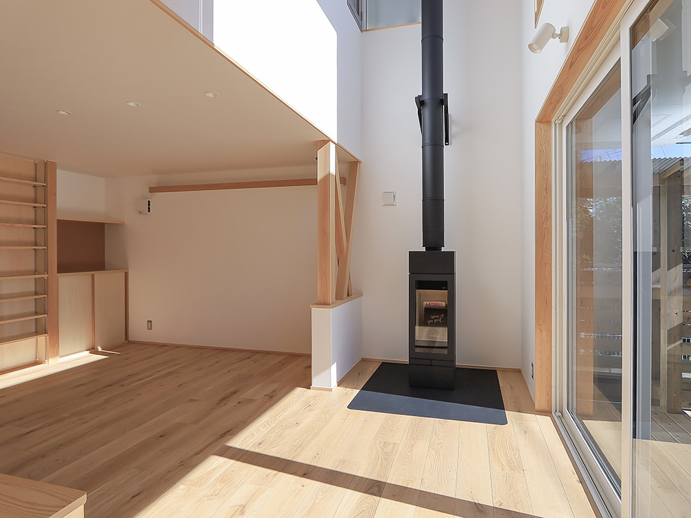 吹抜けのあるリビングは、薪ストーブの炎を楽しめるやすらぎの場所。