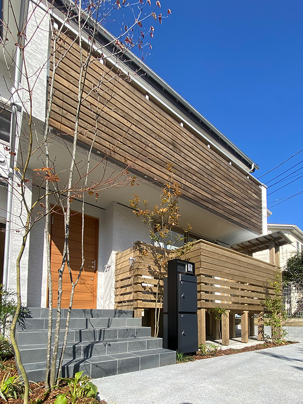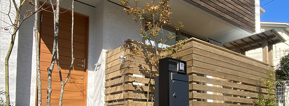 素材の経年変化を楽しめる、そとん壁の外壁と、ウッドロングエコで仕上げたウッドフェンス、ウッドデッキ。
